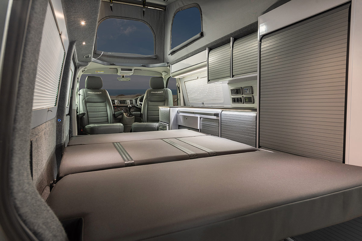 The Freerunner - offering a 3 seat 4' 2" wide comfort seatbed, purpose designed to perform both as a practical comfortable campervan & still be used as an everyday vehicle.