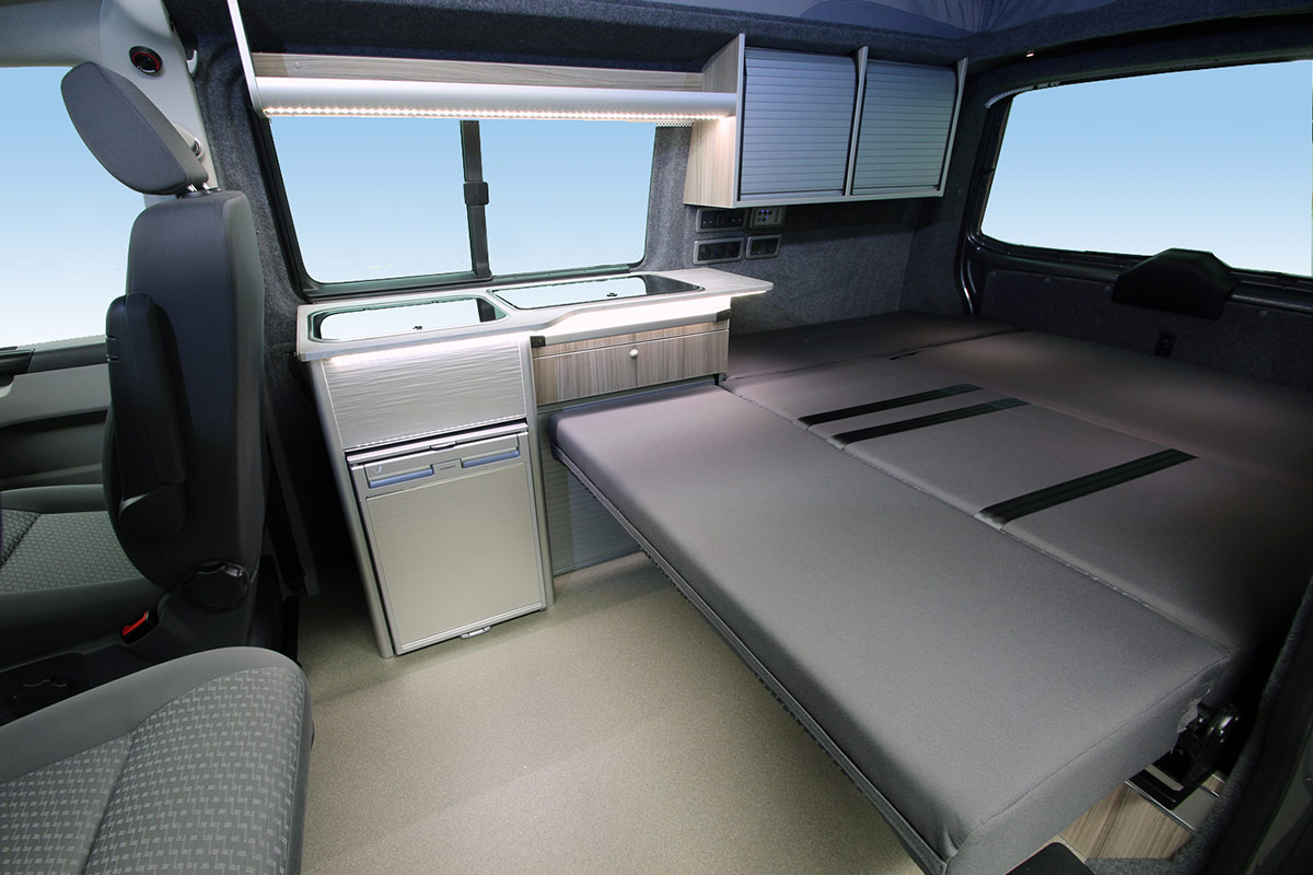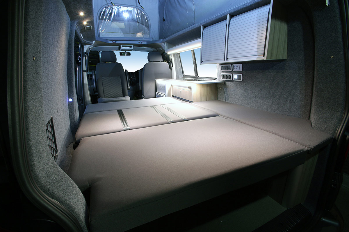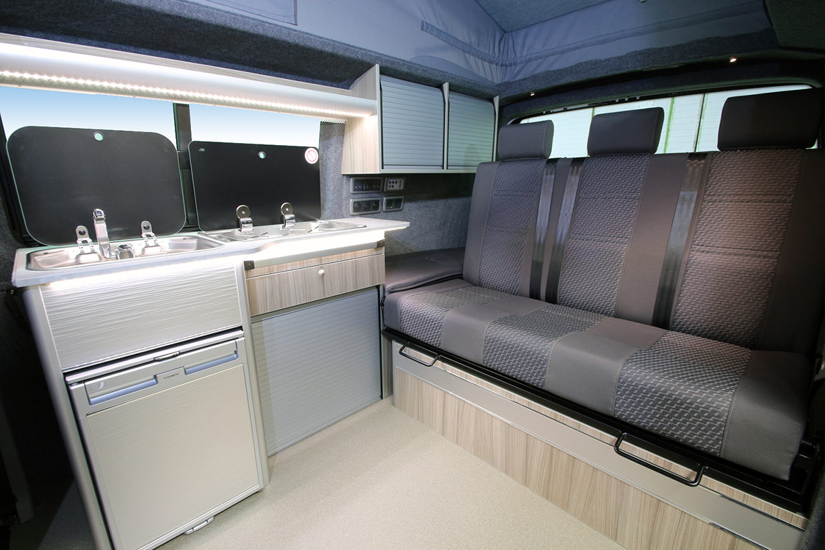 The Freestyler campervan conversion features the 3 seat 4’ 2” wide comfort seatbed, allowing the maximum available bed area via the full width upper body extension whilst still retaining full kitchen facilities.