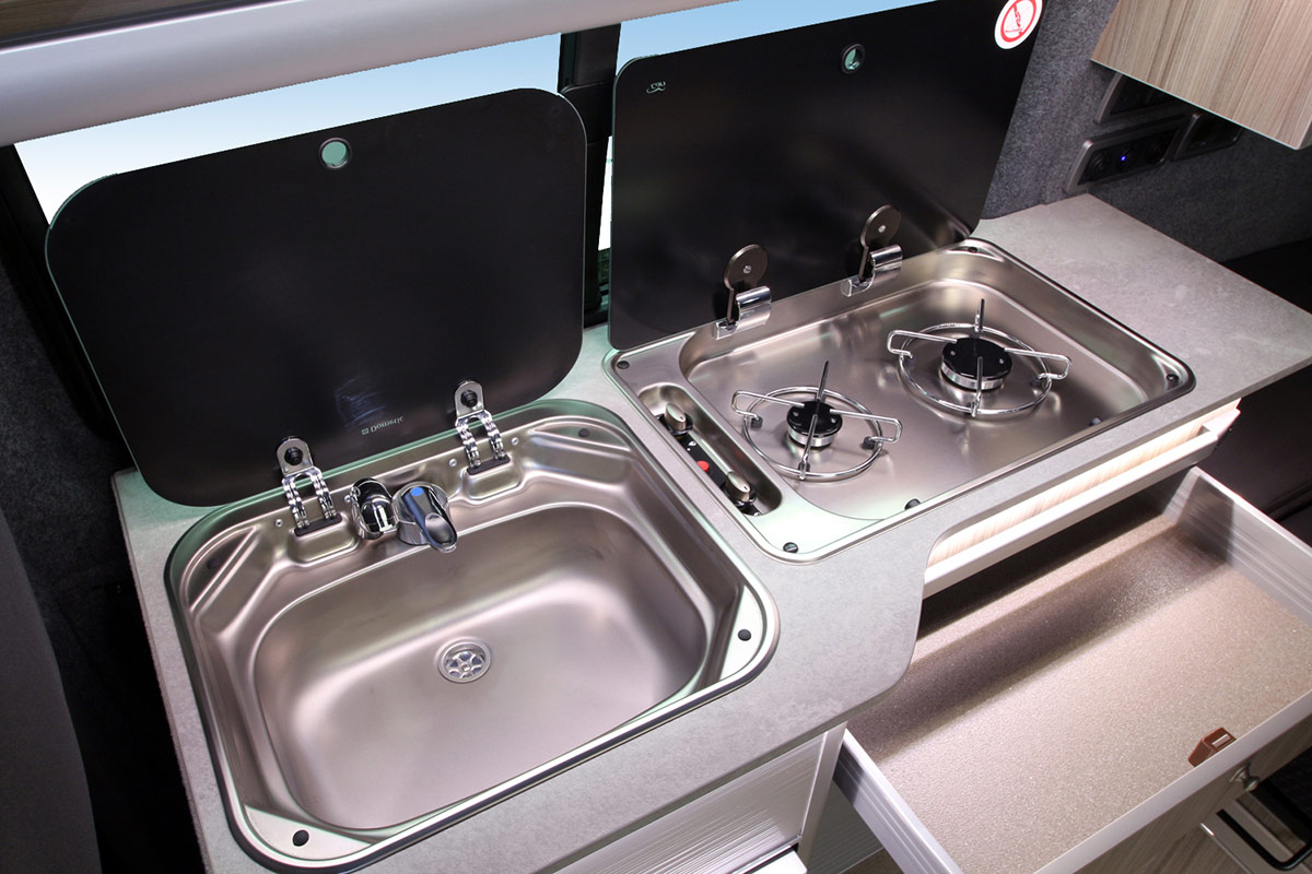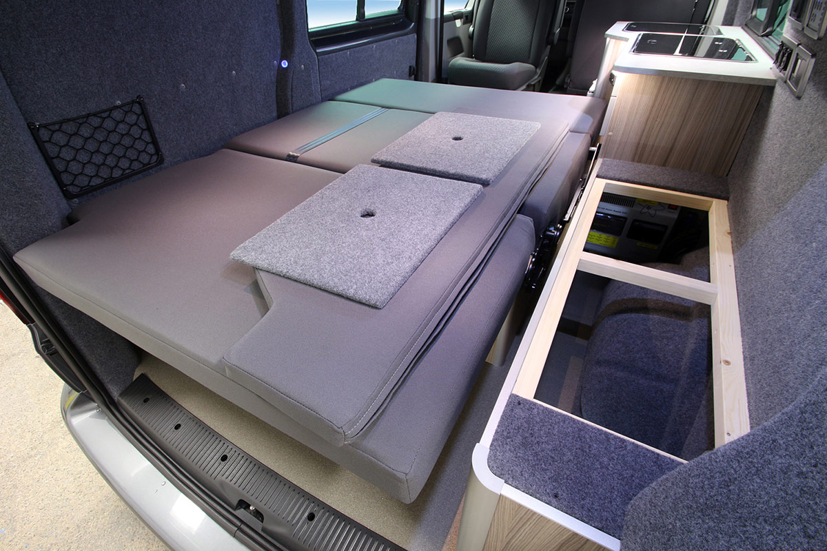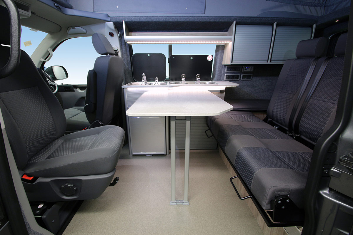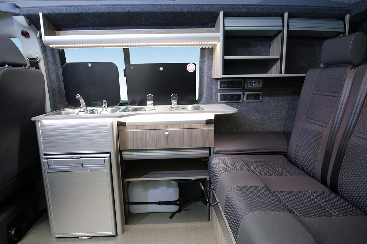 The Freestyler campervan conversion features the 3 seat 4’ 2” wide comfort seatbed, allowing the maximum available bed area via the full width upper body extension whilst still retaining full kitchen facilities.